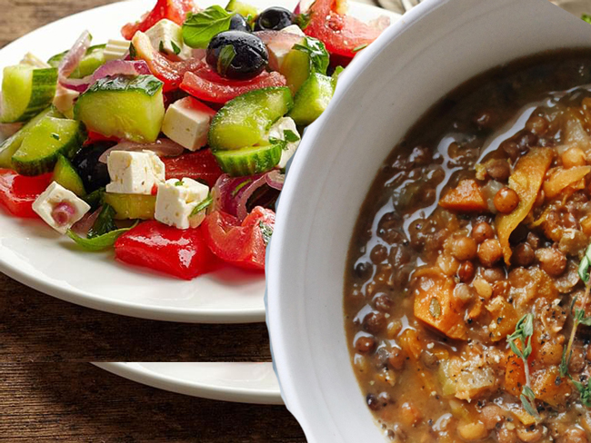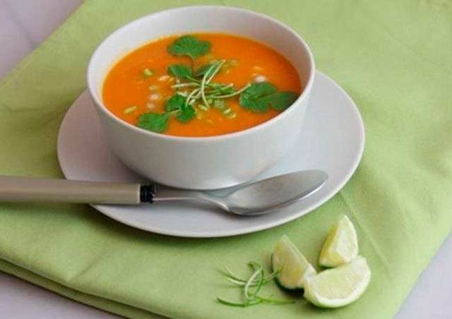 – En plat : Poivron farci végétarien dans son bouillon – En dessert : Crème de coco, sirop de fruit et amandes effilées
